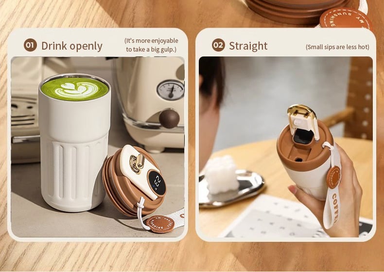Introducing our portable coffee thermal mug with temperature display, a must-have for coffee fans who appreciate precision and convenience.