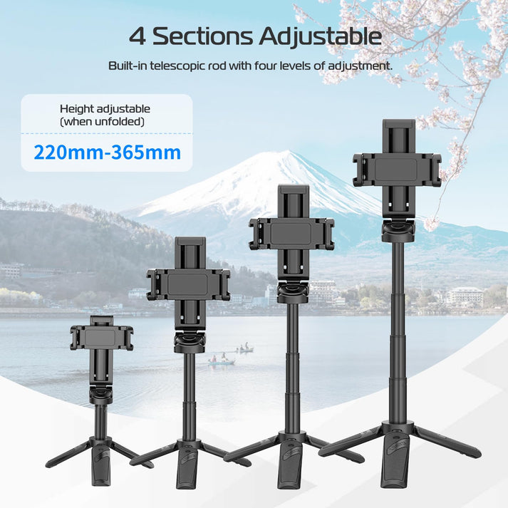 【Adjustable and Flexible】Featuring a four-section adjustable telescopic rod, this selfie stick can be set at various heights ranging from 220mm to 365mm, ensuring you capture the perfect angle for your photos.In addition, double Cold Shoe Mounts --- JJ02 has its own cold shoe mount design, which allows fixing microphones, photographic lights and other equipment.